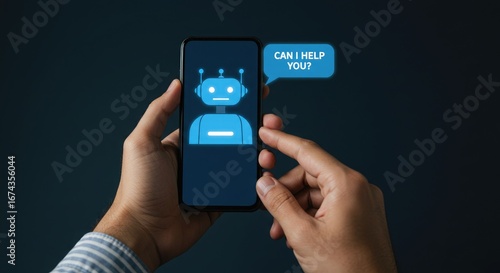 smartphone, mobile phone, ai, artificial intelligence, technology, communication, customer service, support, app, interface, screen, digital, online, help, assistance, conversation, message, bot, robot, user, holding, hand, person