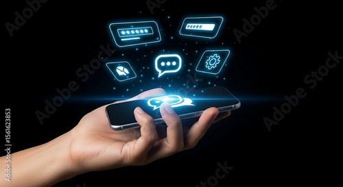 smartphone, hand, communication, messaging, chat, icon, technology, app, online, digital, network, connection, interface, mobile, neon, glowing, futuristic, password, setting, mail, security, datum, information, cyberspace