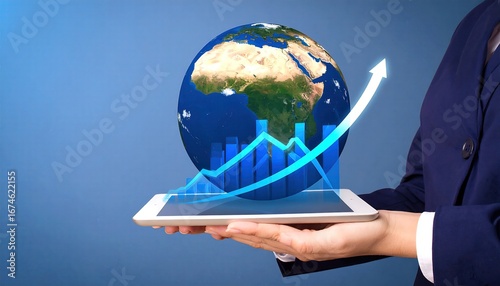 Person Holding Tablet Showing Globe and Rising Chart with Blue Tones Against a Blue Gradient Background