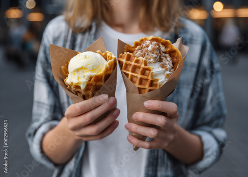 Person holding two waffle cones with ice cream, one in each hand. Street food vendor concept with brown paper wrapping
