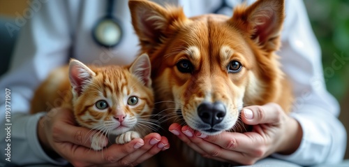 Person holds cute kitten, dog. Vet examines pets. Hands caress animals. Caring vet visits. Adorable pets closeup. Health care concept. Animal clinic. People love pets. Closeup view of animal. Happy