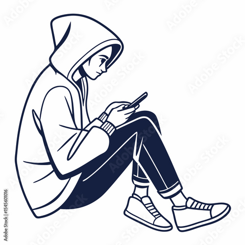person, hoodie, sitting, smartphone, phone, mobile, technology, casual attire, young, adult, leg, shoe, sneaker, jean, pant, apparel, clothing, fashion, style, illustration, graphic, design, vector, outline, monochrome, minimalist, simple, digital, cyberspace, communication, connection, modern, trendy