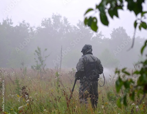 person, military, foggy, field, walk, gear, green, nature, mist, wood, cloudy, rainy, tactical, clothing, equipment, hunting, exploration, landscape, hidden, camouflage, calm, silent, adventure, observer, sharpened