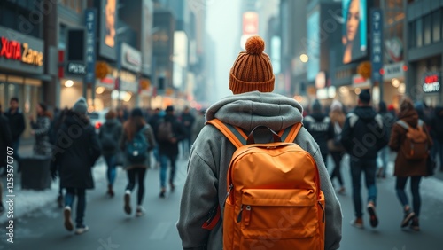 individual, visual, warmth, engagement, excitement, metropolis, solitude, exploration, movement, atmosphere, tied-up, crowd, vibrant, commerce, journey, expression, photo, scene, route, people, energy, morning, footwear, pedestrian, portrait, city life, modern, urban, orange, character, lifestyle, backpack, fashion, activity, casual attire, adventure, travel, architecture, city landscape, winter, street, city, tour tourism, bustling