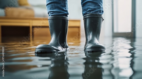 Person in rubber boots standing in a flooded house with water covering the floor, depicting a home flood or water damage situation.