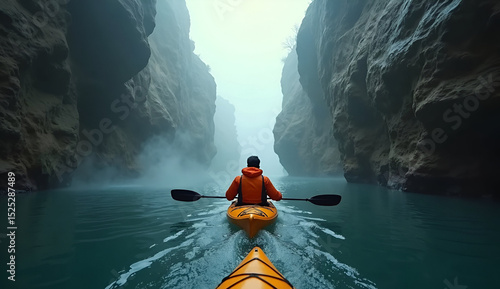 kayak, person, canyon, narrow, water, adventure, sport, recreation, fitness, leisure, professional, amateur, training, practice, competition, dynamic, motion, vibrant, sharp, depth, equipment, texture, detail, sunlit, scene, kayak, closeup