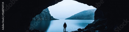 person, silhouette, cave, opening, inlet, water, coastal, ocean, sea, rock, dark, blue, grey, landscape, nature, view, mountain, shoreline, calm, fog, moody, atmosphere, cold, gloomy, dramatic, outdoors, exploration, travel, solitude, scenery