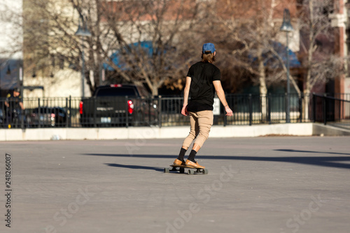 Person riding a skate board in an urban asphalt park