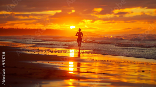 Person running on a beach at sunset – solo runner with ocean waves in the background, vibrant sunset colors.