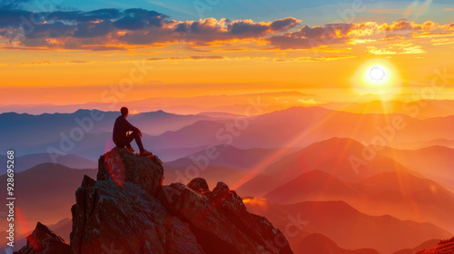 Person sitting on a rocky mountain ledge, admiring a breathtaking sunset over a vibrant mountain range landscape