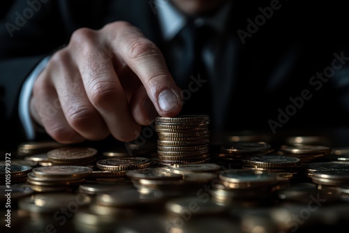 Person stacking gold coins, representing wealth, investment, and financial growth in a dark background setting.