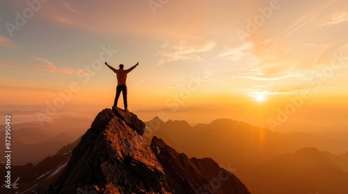 person standing on a mountain peak with arms raised in triumph at dawn
