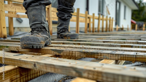 person, standing, wooden, platform, raised, viewpoint, perspective, height, up high, ground, looking, distant, view, observation, overlook, outdoors, nature, landscape, exploring, adventurer, traveler, horizon, sky, alone, discovery, sightseeing, excursionist, touristic, holiday maker, exploration, panoramic, elevated, scenic view, destination, tour tourism, hiker, trail, adventure