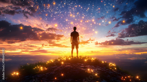 person stands on hilltop, gazing at starry sky filled with glowing lights and vibrant sunset. scene evokes sense of wonder and inspiration