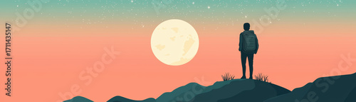 person, mountain, moon, star, landscape, silhouette, night, adventure, nature, sky, horizon, exploration, backpack, calmness, scenery, travel, solitude, wilderness, calm, journey, view, peaceful, atmospheric, dusk, hiking, freedom, beauty, inspiration, destiny, celestial, immensity, serene, elevation