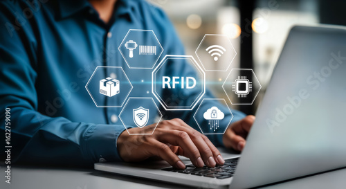 Person using a laptop with rfid technology icons and symbols overlaid, representing wireless identification, tracking, and data management in modern business operations
