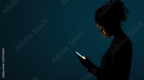 person, smartphone, dark, glow, silhouette, technology, communication, profile, female, casual attire, modern, lifestyle, night, screen, light, expression, thoughtful, portrait, black, hair, curly, standing, half face, urban, connection, sharpened, hand, device, youth, emotion, solitude, digital, privacy, contemplation, evening, shadow, minimalism, calm, serene, quiet, alone, interaction, ambient, soft light, beauty