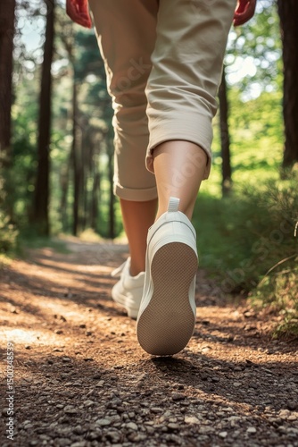 woman, walking, path, forest, leg, shoe, sunlight, nature, hiking, outdoors, trail, tree, green, beige, light, sneaker, white, brown, gravel, dirt, ground, female, footwear, travel, activity, exercise, person, view, low, close, detail, motion, perspective, photo, wood, sunshine, healthy, fresh, journey
