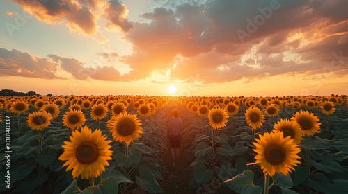 person, walking, field, sunflower, sunset, sky, cloud, orange, yellow, green, nature, summer, sun, horizon, gold, agriculture, plant, flower, blossom, beauty, landscape, scenic, bright, vibrant, warm, peaceful, happy, day, afternoon, evening, dusk, light, ray, glow, rural, meadow, path, lone, single, standing, looking, ahead, future, hope, joy, life, growth, serenity