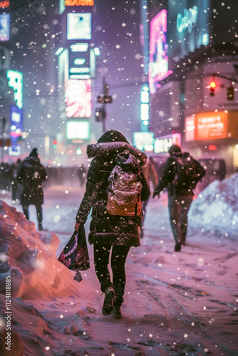 Person Walking Through a Snowy City at Night with Neon Lights and Falling Snow