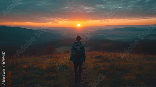 sunrise, sunset, landscape, person, hill, mountain, nature, view, travel, adventure, dawn, dusk, gold, hours, backpacker, hiker, solitude, serenity, calmness, peaceful, calm, hope, inspiration, majestic, panorama, scenic, sky, cloud, horizon, warm, orange, yellow, blue, green, autumn
