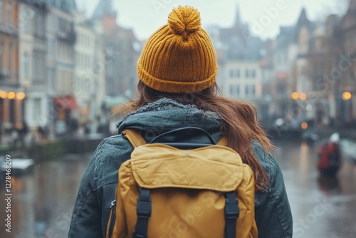 canal, city, travel, adventure, backpack, overcast, urban, scenery, contemplation, beanie, architecture, exploration, waterfront, lifestyle, rainy day, tour tourism, wanderlust, autumn, backpacker, nature, water, street, historic, people, leisure, journey, excursionist, cloudy sky, cosy, vibe, life events, surrounding, casual attire, environment, connection, discover, weekend