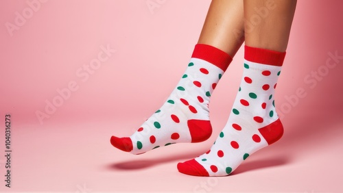Person wearing stylish white socks with blue polka dots, set against a vibrant pink background. Perfect for fashion, comfort, and playful style.