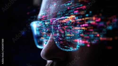 Person with glasses on head using generative ai technology in a futuristic lifestyle setting