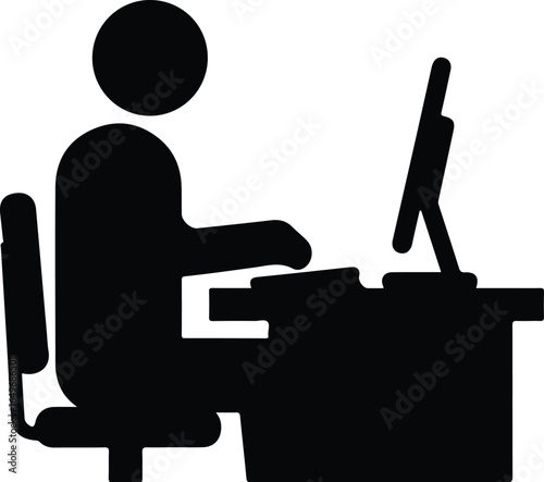 person, computer, desk, work, office, employee, men at work, job, business, technology, digital, screen, keyboard, mouse, chair, sitting, typing, datum, information, cyberspace, online, professional, career, occupation, task, project, productivity, efficiency, workplace, workstation, graphic, icon, symbol, silhouette, black, white, simple, minimalist, design, illustration, vector, clip art, image, picture, pictogram, signs, human, figure, man