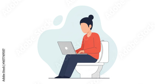 Person working on laptop while sitting on toilet; illustration for articles about work-life balance, remote work challenges, or humor.