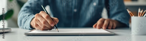 person writing on a tablet with a pencil, capturing creativity and modern technology in a workspace.