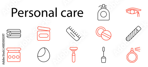 personal, care, icon, lotion, mirror, shampoo, cream, lipstick, comb, make-up, cosmetic, skincare, grooming, beauty, hygiene, spa, face, body, bathe, fashion, style, vector, illustration, concept, wellness