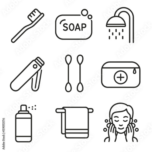 personal, hygiene, icon, outline, style, toothbrush, soap, bar, shower, head, nail, clipper, cotton, swab, kit, deodorant, spray, towel, icon, face, laundered, text, label, isolated, transparent, background