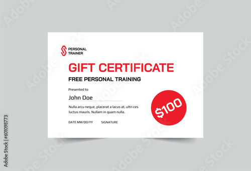 Personal Trainer gift certificate template. A clean, modern, and high-quality design gift certificate vector design. Editable and customize template gift certificate