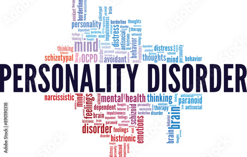 personality, disorder, mental health, thinking, psychotherapy, psychiatry, sensitive, dependant, environment, gene, mental, bipolar, borderline, social, anti-social, therapy, narcissism, paranoid, histrionic, behaviour, skill, thought, distress, mind, typography, collage, cloud, white, tags, text, background, word, concept, isolated, design, vector, illustration