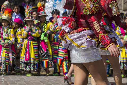Peruvian dancers at the parade in Cusco. People in traditional clothes.