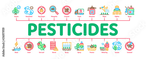 Pesticides Chemical Minimal Infographic Web Banner Vector. Pesticides For Agricultural Field Processing By Plane, Bottle Spray And Equipment Concept Illustrations