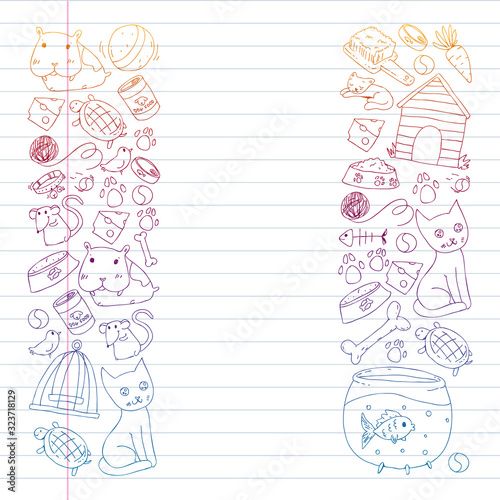 Pet shop. Vector illustration with animals, dog, cat, fish, Colorful background with kitten, bird, puppy. Veterinarian clinic.
