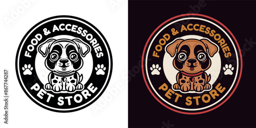 Pet store vector round emblem with cute cartoon dog character illustration in two styles black and white and colored