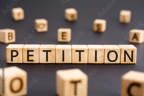 Petition - word from wooden blocks with letters, a formal request petition concept, random letters around black background