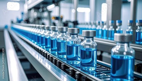 pharmaceutical, manufacturing, conveyer, bottle, liquid, blue, glasses, factory, automation, production, modern, technology, medicals, science, clean, sterile, precise, industrial, equipment, processing, cardboard box, bottling, assembly, line, workflow, efficient, cleanliness, high technology, robotic, precisely