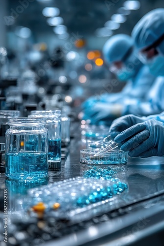 sterile, laboratory, manufacturing, pharmaceutical, men at work, glove, bottle, ampoule, equipment, clean, technology, science, blue, pill, research, production, modern, precise, sharpened, chemical, future