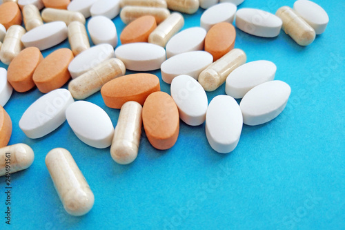 Pharmaceutical pills, tablets and capsules on blue background. Medicine concept, pharmacy, treatment and drugs prescription theme