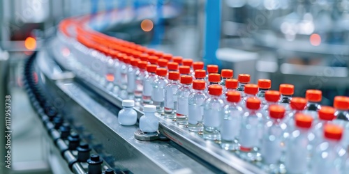 Pharmaceutical production line filled with vials and lids.