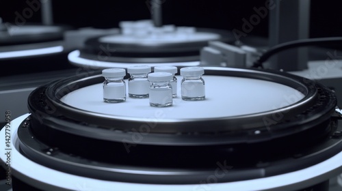 pharmaceutical vials awaiting processing on automated carousel under aseptic manufacturing conditions in a cleanroom environment