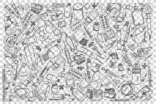 Pharmacy doodle set. Collection of hand drawn sketches templates patterns of pills syringe pharmacological drugstore equipment on transparent background. Healthcare and medical support illustration.