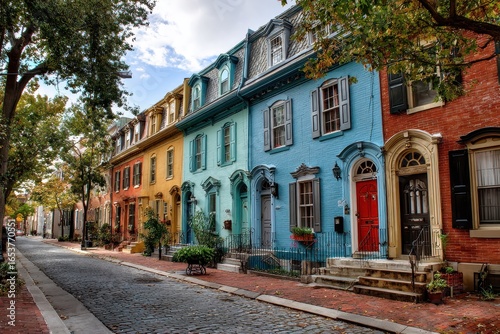 Philadelphia Street: Vibrant Row Houses in Center City with Beautiful Blue Sky