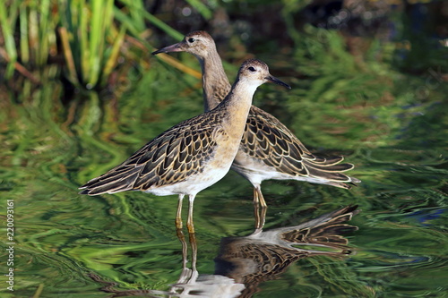 Philomachus pugnax. Ruffs in the late summer among the waves in the North of Siberia