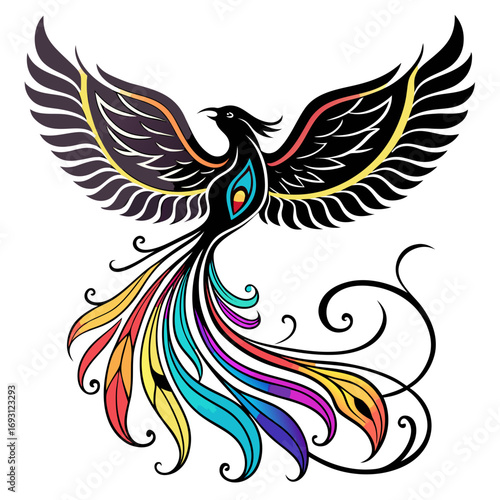 Phoenix Illustration for Stock, Stylized Bird with Rainbow Tail.