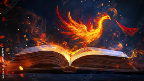 phoenix, rising, schoolbook, page, feather, tassel, rebirth, transformation, education, fantasy, glowing, ember, flames, magical, powerful